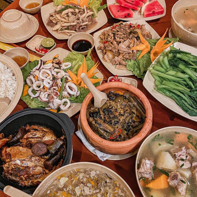 | – Salad rau trộn – Nem Việt – Bò hầm củ quả – Rau vườn Yên Tử xào (luộc) theo mùa – Cá mòi kho tộ – Canh nấm nấu chua – Cơm tám thơm – Hoa quả tráng miệng |